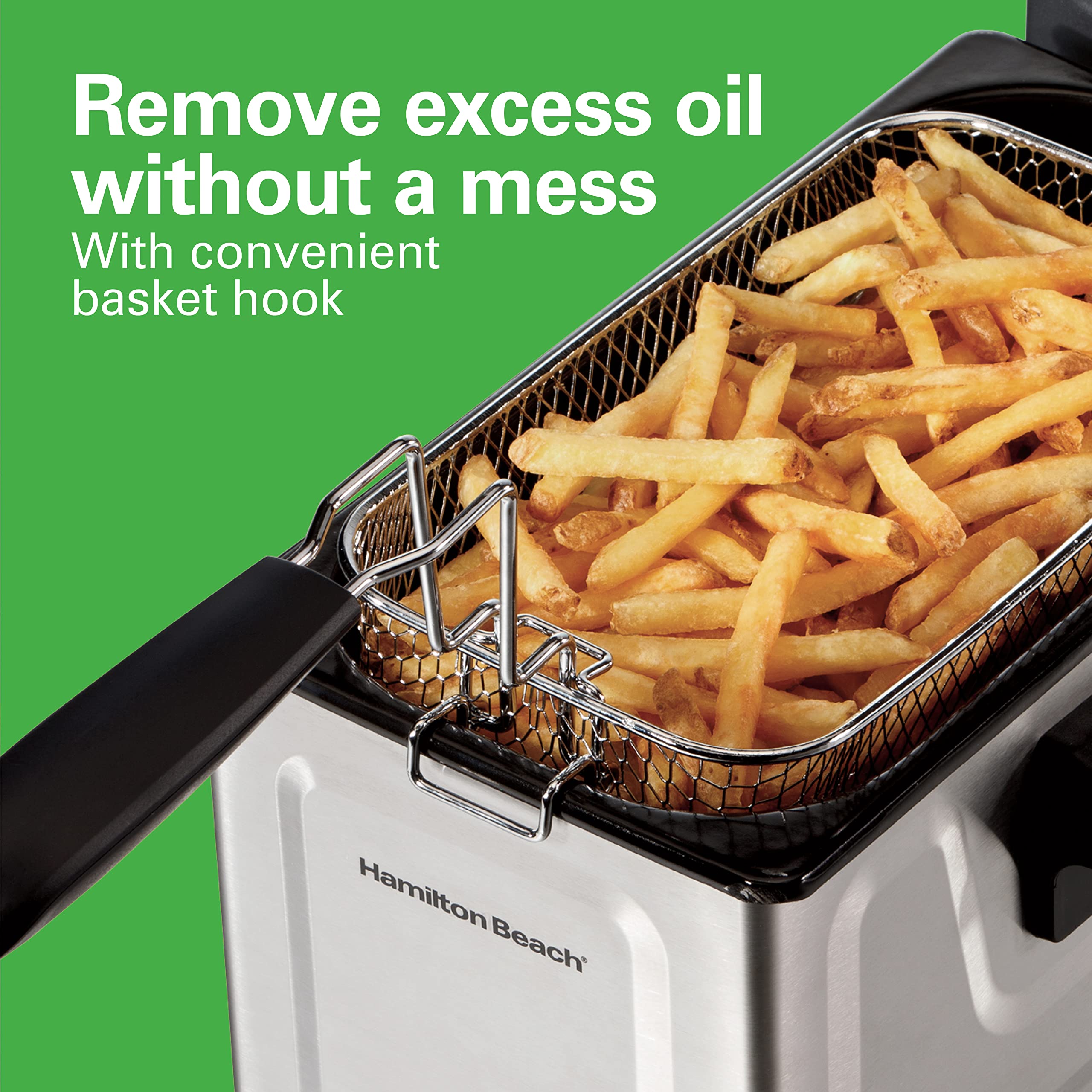 - REMOVE EXCESS OIL WITHOUT MESS: The basket on the electric deep fryer has a hook for easy, mess-free draining after frying and the lid covers the hot oil and food during cooking to prevent messy splatter.