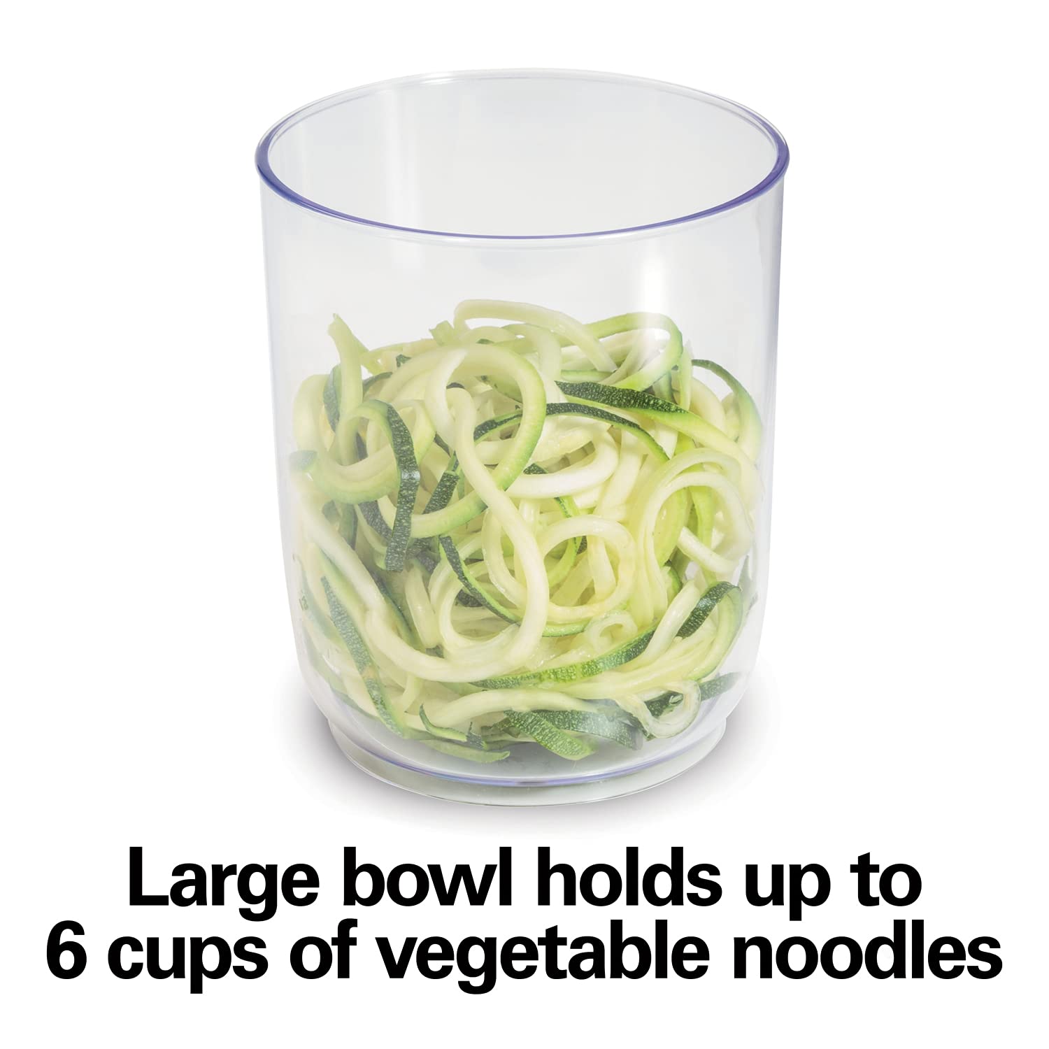 - HOLDS UP TO 6 CUPS: The large bowl on the spiralizer for veggie noodles is just the right size for making family meals and for recipes. It holds up to 6 cups of vegetable noodles.