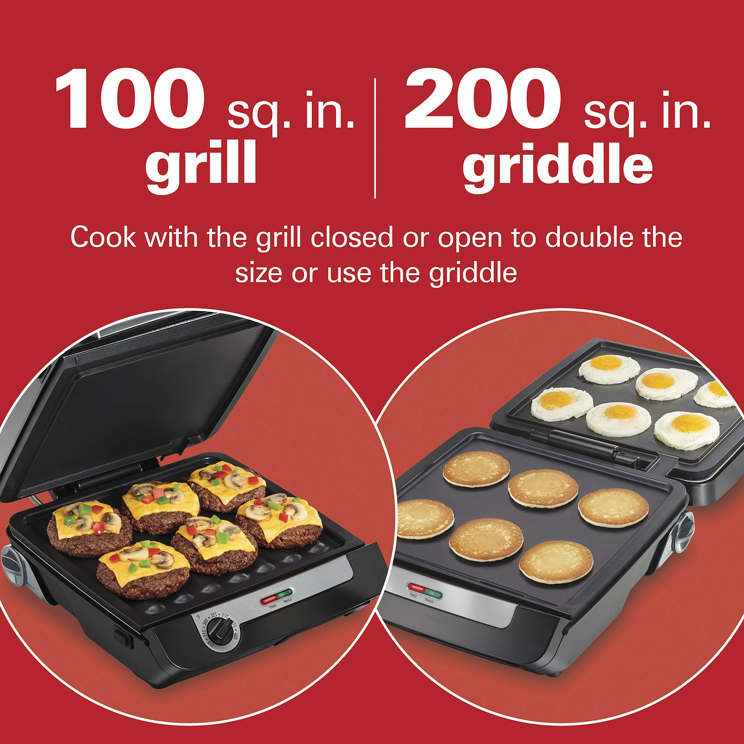 Hamilton Beach 4-in-1 Indoor Grill & Electric Griddle Combo with Bacon Cooker, Opens Flat to Double Cooking Surface, Removable Nonstick Plates, Black & Silver (25601)