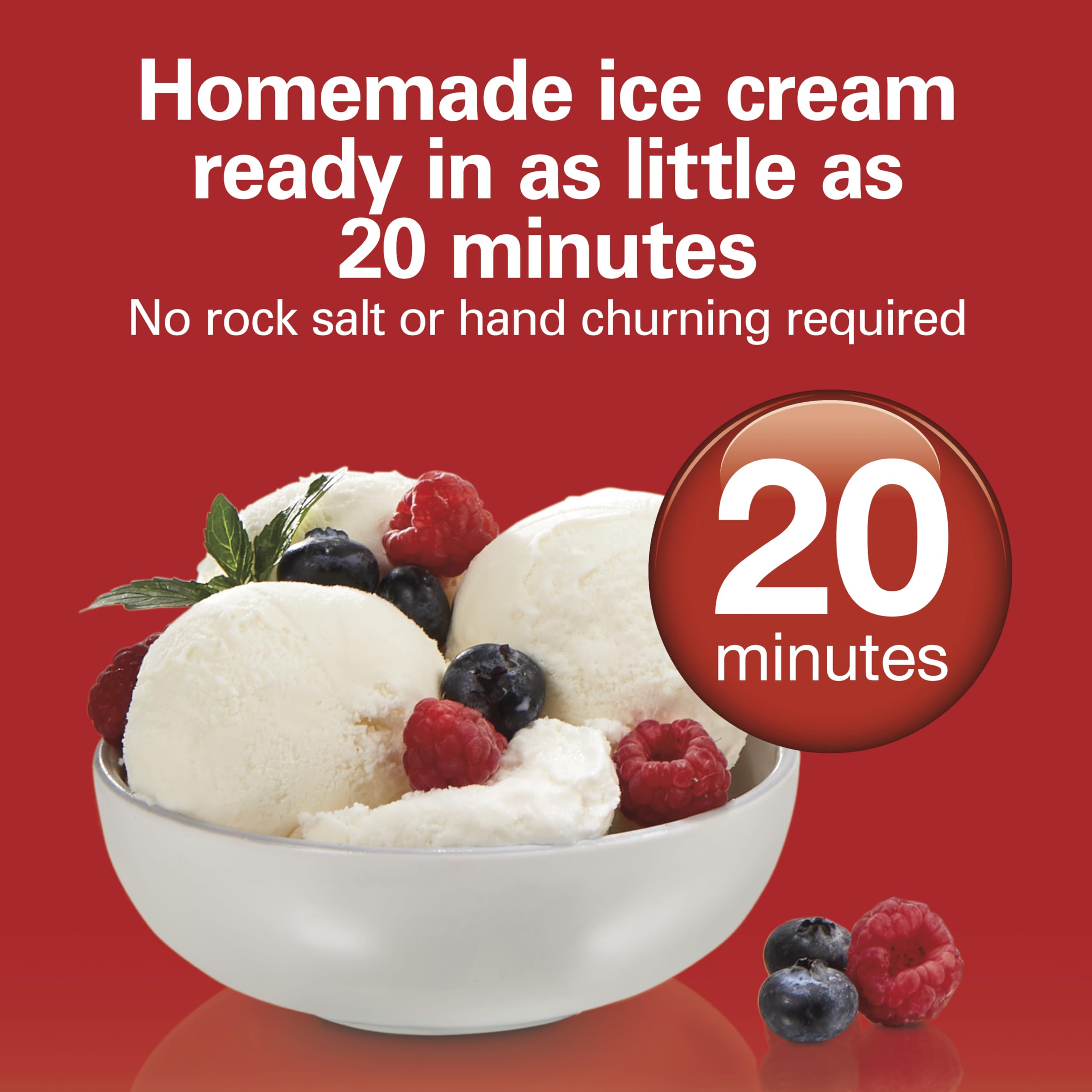 - HOMEMADE ICE CREAM IN 20 MINUTES: No more waiting all day when you're craving a homemade frozen treat. This ice cream machine makes ice cream fast and works with a simple on/off switch. No rock salt or hand churning needed.