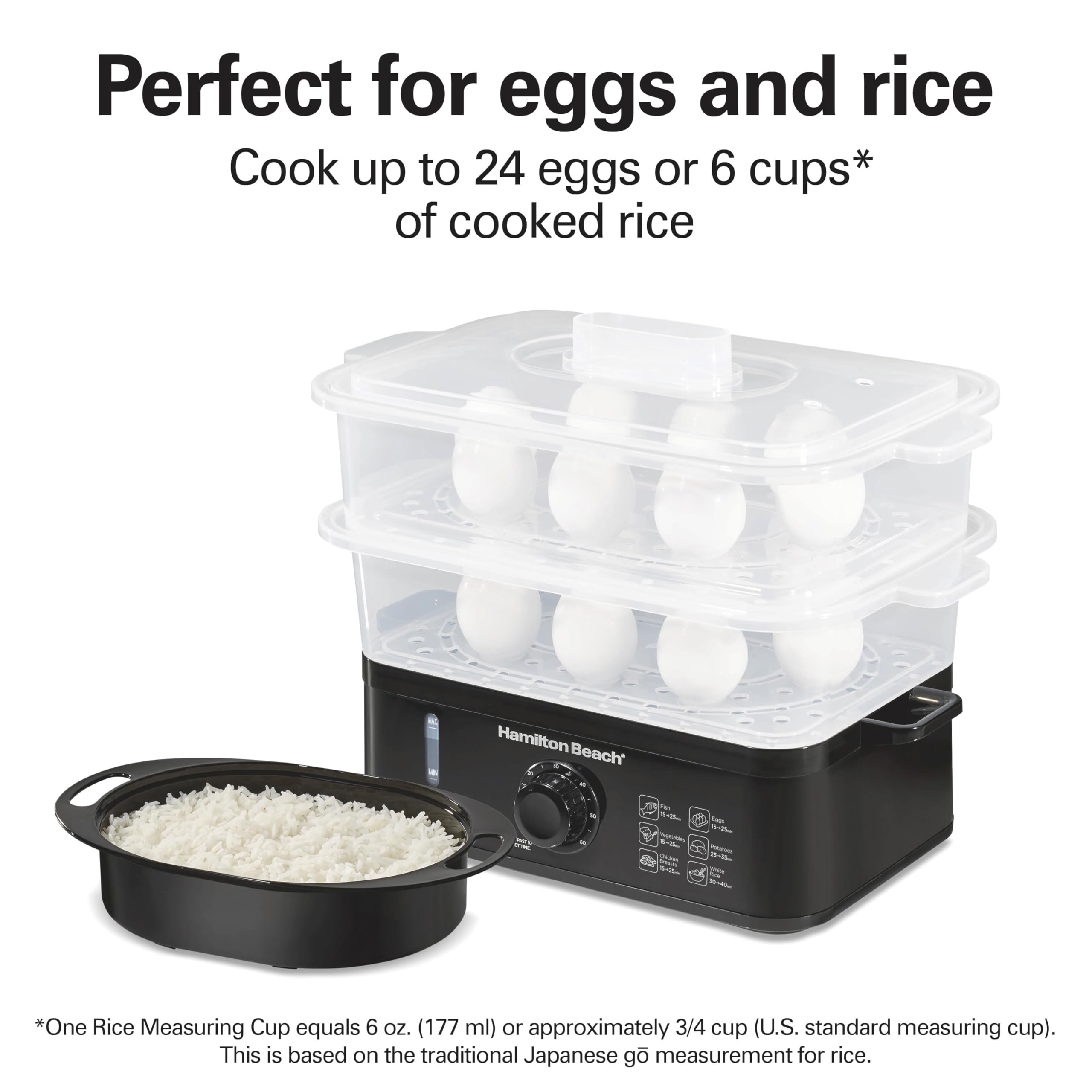 Hamilton Beach Electric Food Steamer, Rice Cooker & Egg Boiler for Quick, Fast Healthy Cooking with Stackable Three-Tier Bowls for Vegetables and Seafood, 9.5 Quarts, Auto Shutoff, Black (37430)