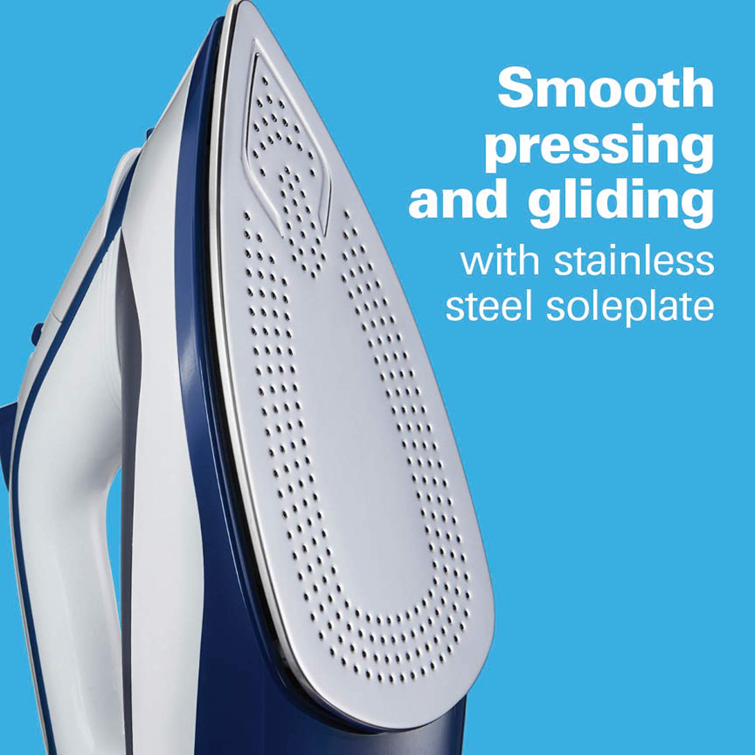 - SMOOTH PRESSING AND GLIDING WITH STAINLESS STEEL SOLEPLATE. From pressing down on thick fabrics to gliding over hems, the stainless steel soleplate moves easily over fabrics and provides durability for reliable ironing year after year.
