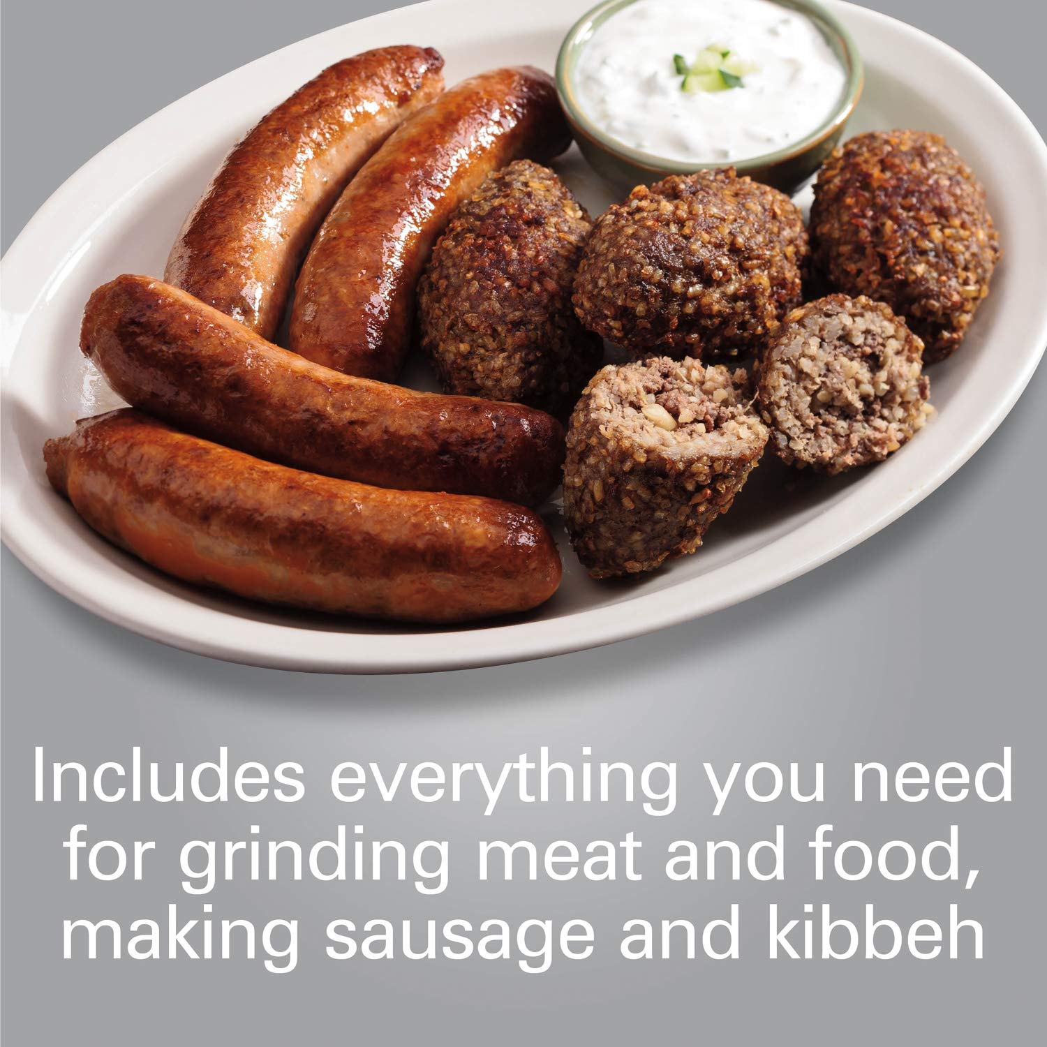 - includes everything you need for grinding, making sausage and kibbe: this kitchen stand mixer attachment includes stainless steel food tray, 3 grinding plates (3mm/4.5mm/7mm), sausage stuffing tube, 2-piece kibbe accessory, and food stomper/pusher.