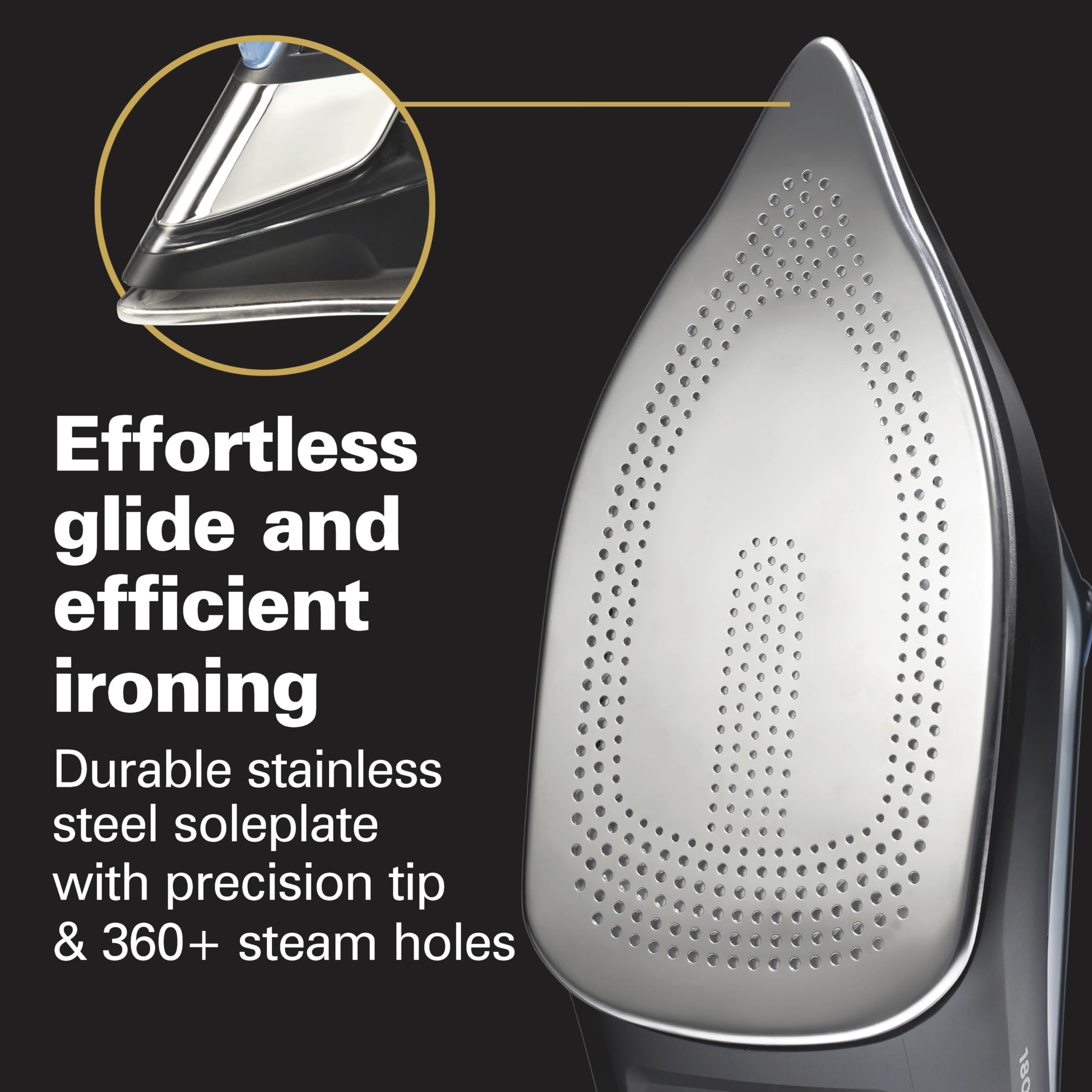 - EFFORTLESS GLIDE AND EFFICIENT IRONING: Durable stainless steel soleplate with precision tip easily reaches into tight spaces. Over 360 steam holes are carefully arranged across the soleplate's surface to deliver wrinkle-releasing steam onto fabrics.