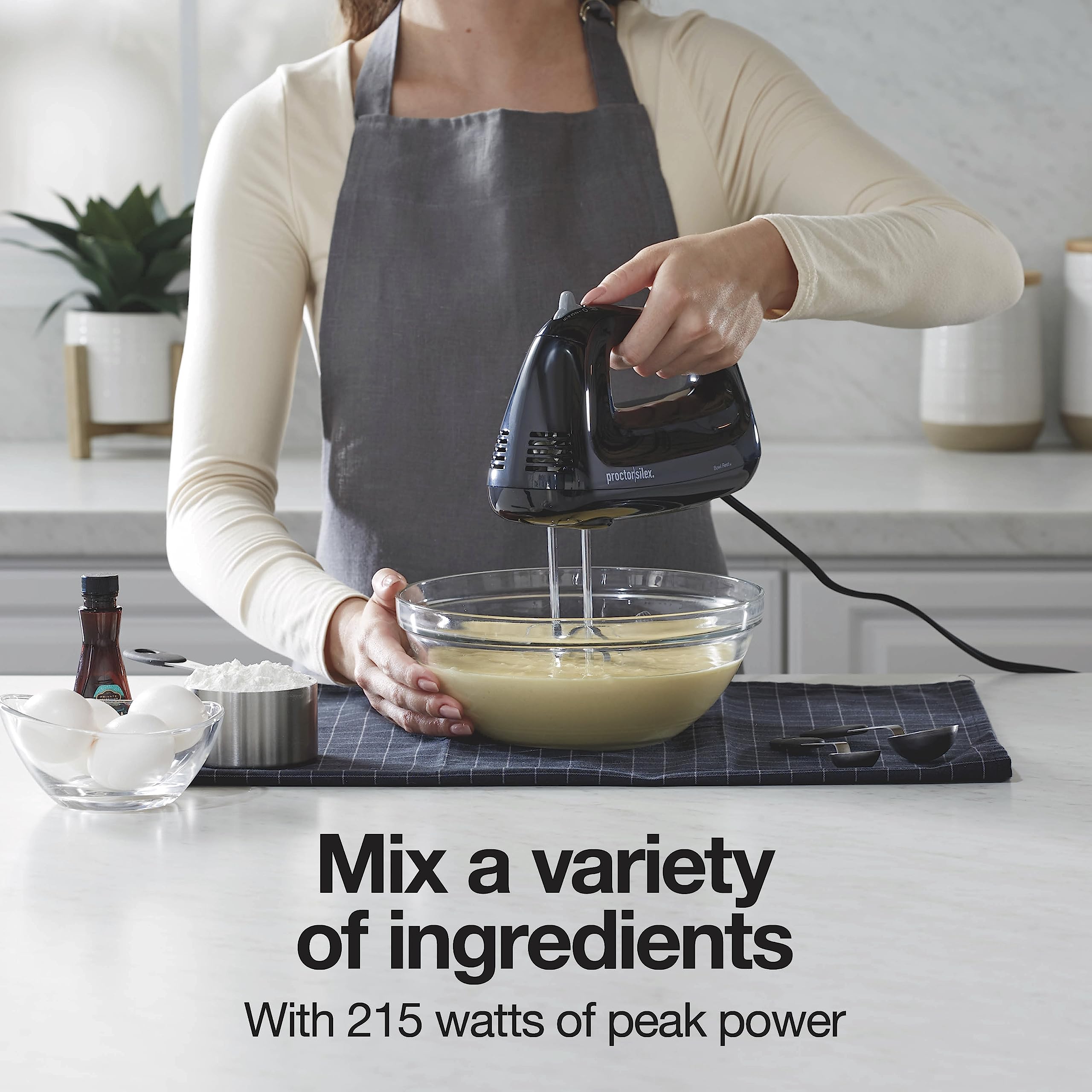 - MIX A VARIETY OF INGREDIENTS: With 215 watts of peak power, the 5 speed hand mixer has all the power you need to mix many different ingredients, whether you're mixing cake batter or whipping cream. Perfect for making your favorite recipes.